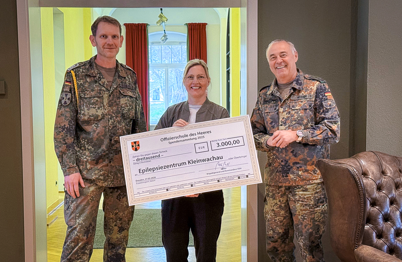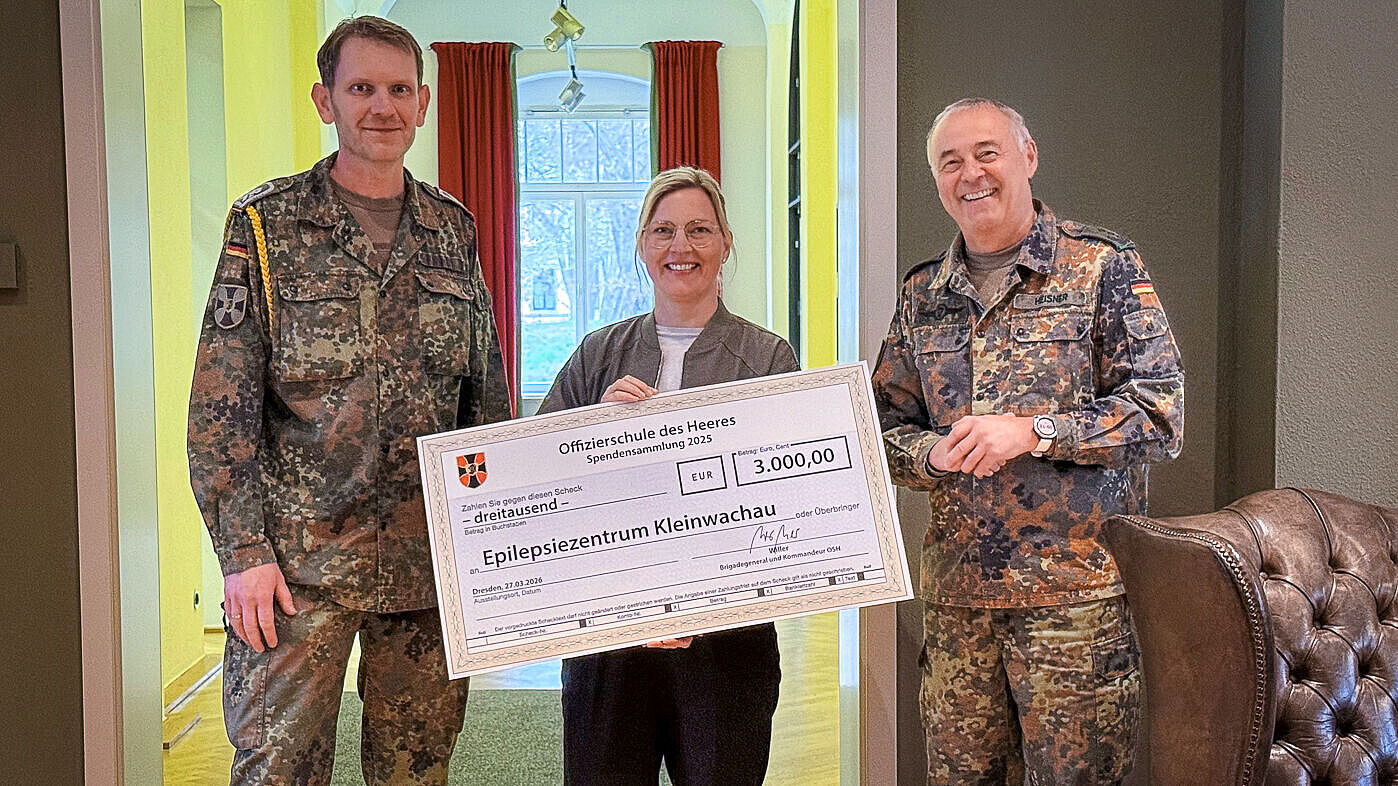 Auch in diesem Jahr setzte die Offizierschule des Heeres (OSH) aus Dresden wieder ein Zeichen der Solidarität. Anfang April überreichten Oberst Heißner (rechts) sowie Stabsfeldwebel Kramer im Namen der OSH der Geschäftsführerin des Epilepsiezentrums Kleinwachau, Sandra Stöhr, einen Spendenscheck in Höhe von 3.000 Euro.