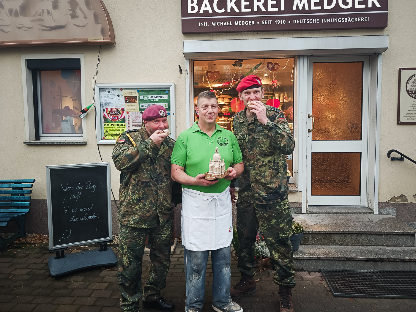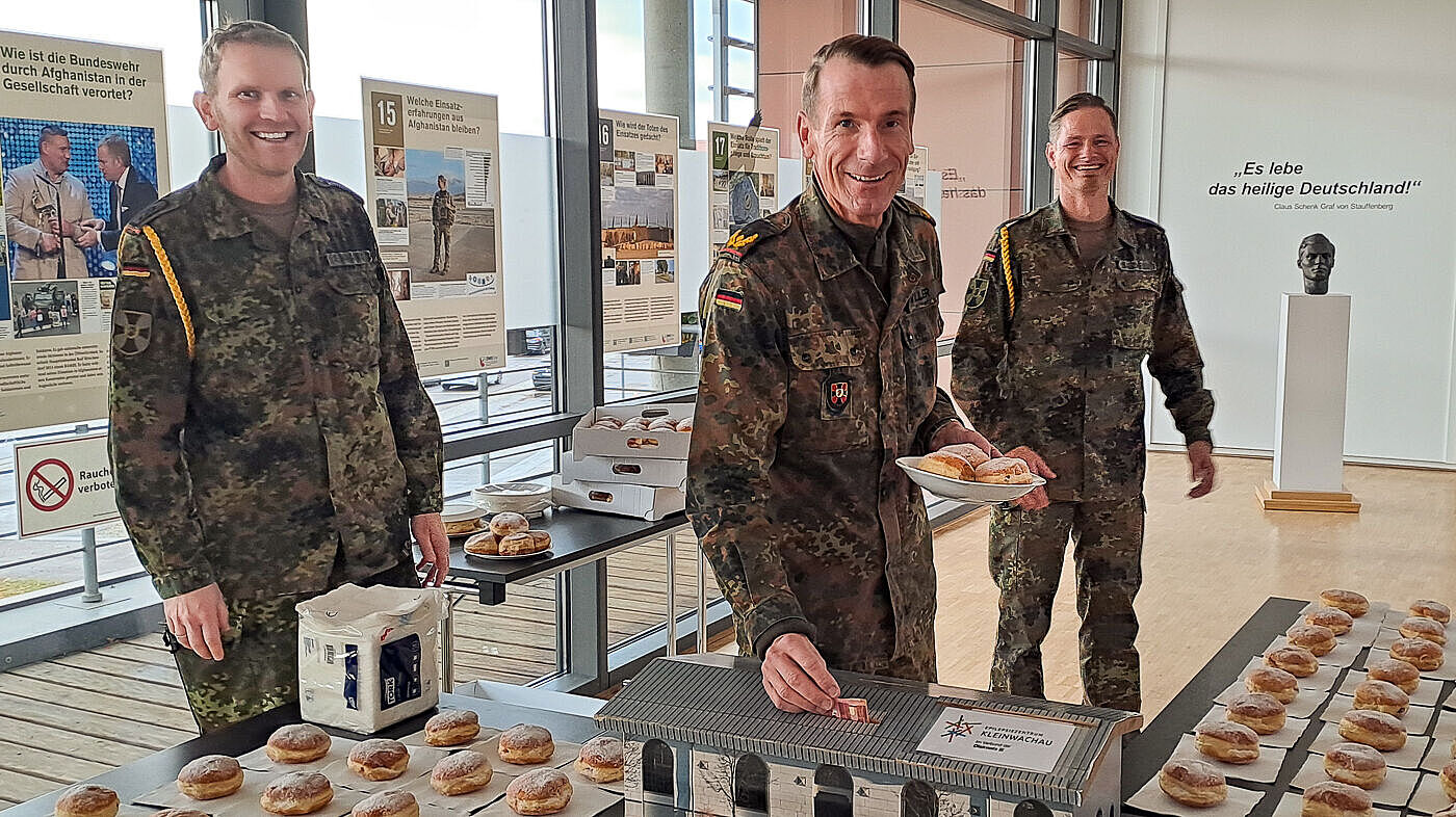 Für die Pfannkuchenaktion holten Stabsfeldwebel Enrico Brose und Stabsfeldwebel Enrico Kramer 800 Pfannkuchen bei Bäckermeister Michael Medger in Dresden-Schullwitz ab. Herr Medger steuerte zusätzlich 200 Kräppelchen bei, sodass der Spendenbetrag für das Epilepsiezentrum Kleinwachau noch erhöht wurde.