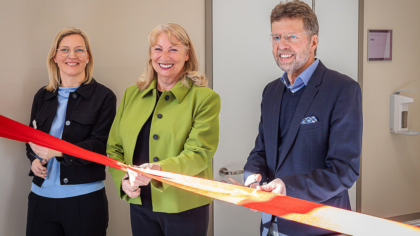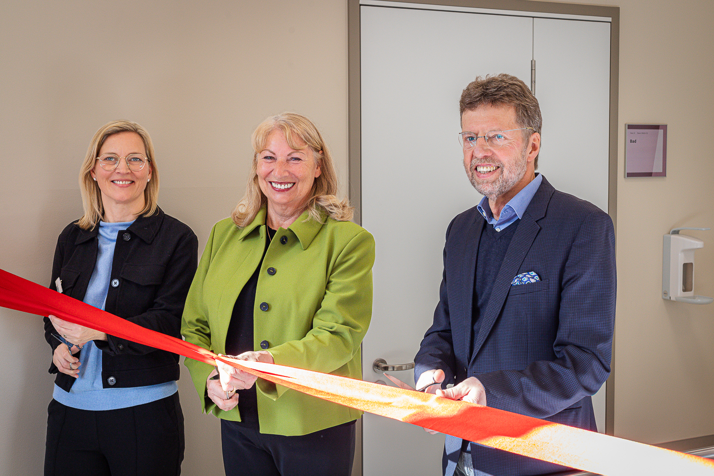 Mit einem feierlichen Banddurchschnitt haben Sachsens Staatsministerin für Soziales, Gesundheit und Gesellschaftlichen Zusammenhalt Petra Köpping, Geschäftsführerin Sandra Stöhr und Chefarzt Dr. Thomas Mayer das neue Klinikgebäude „Haus D“ des Epilepsiezentrums Kleinwachau offiziell eröffnet.