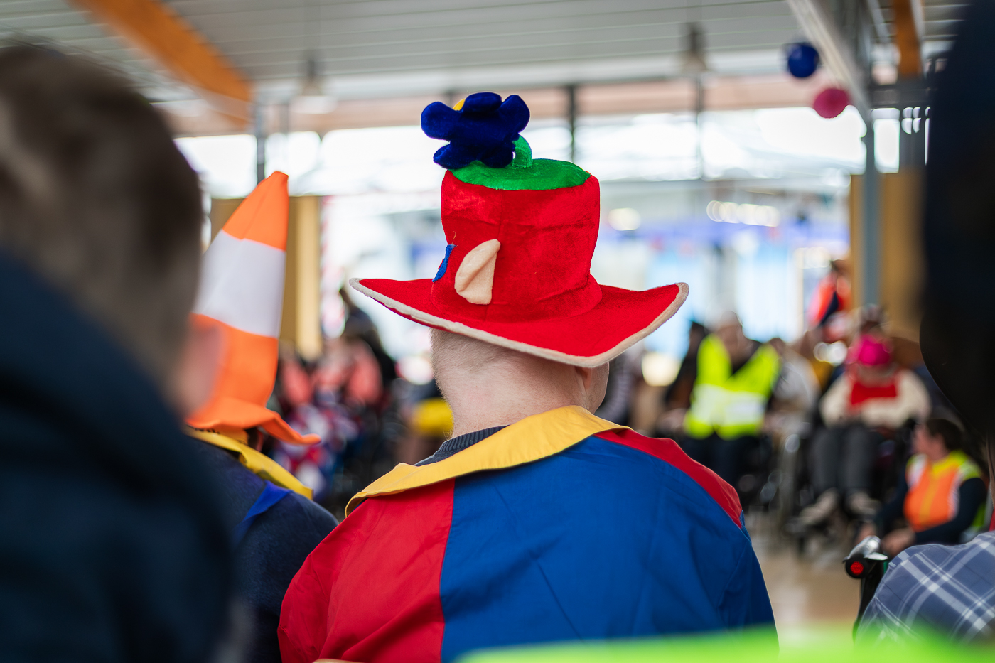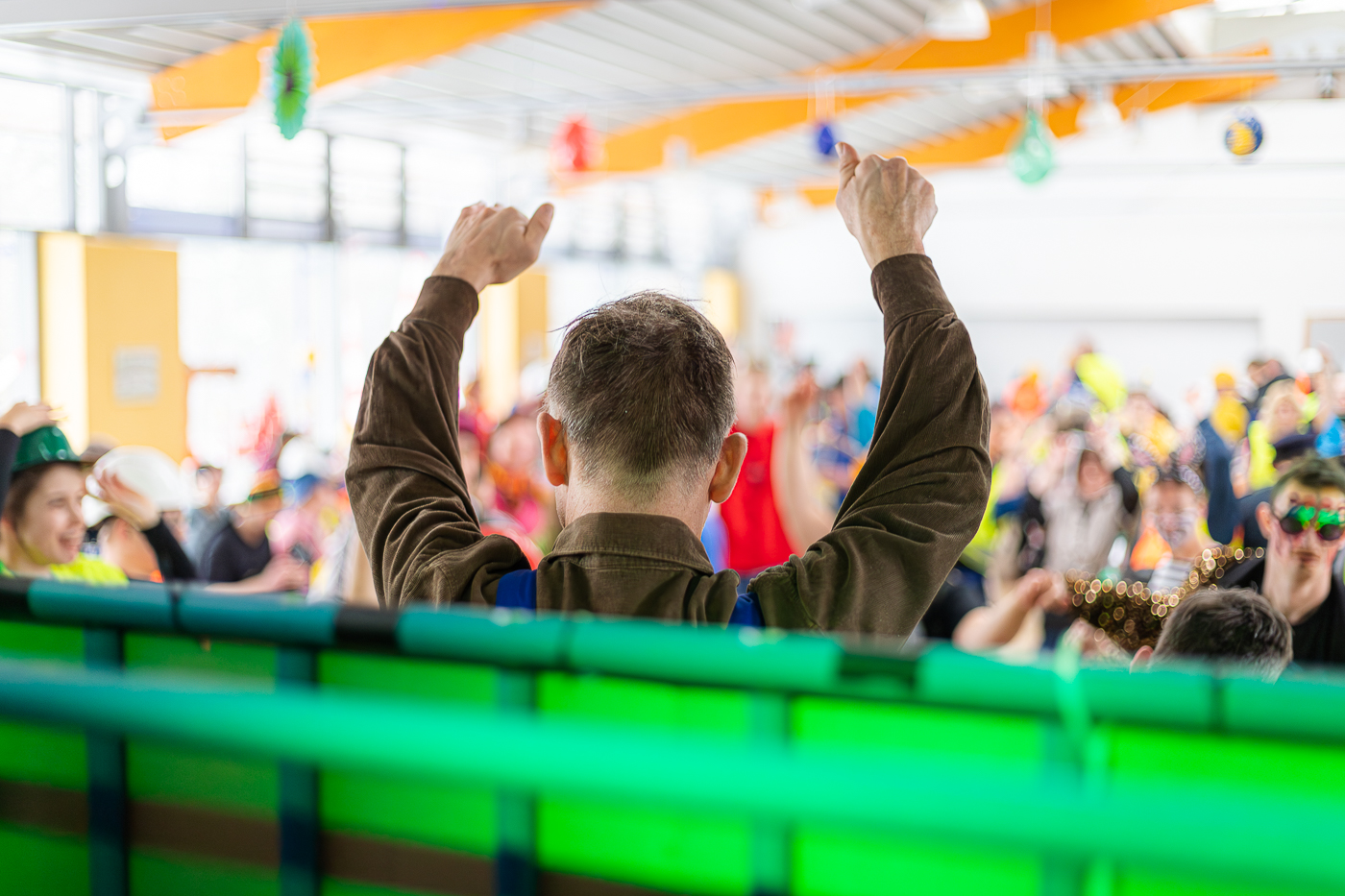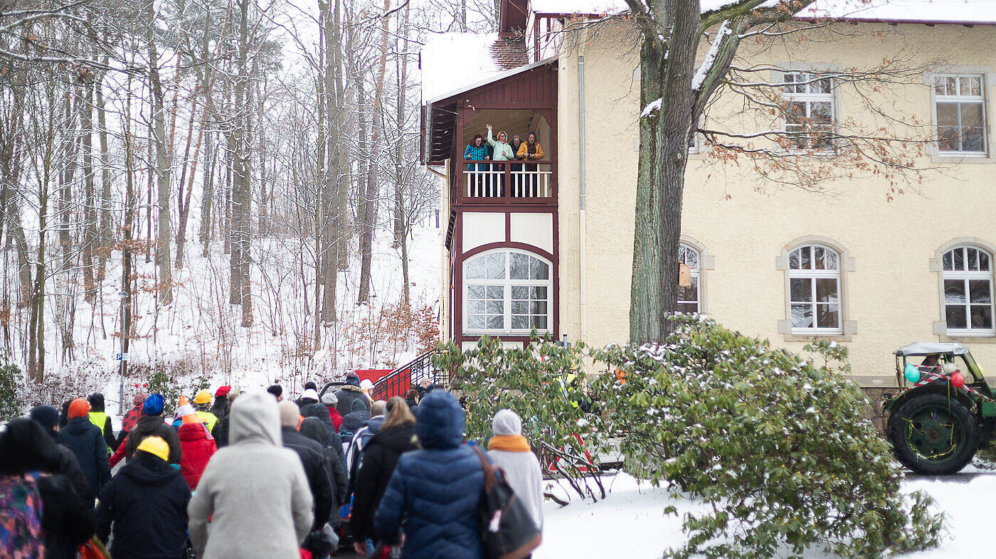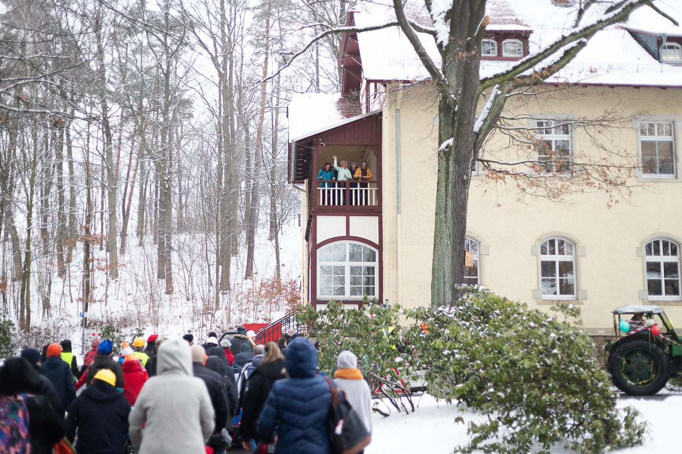 Der Höhepunkt war der Karnevalszug – mit Wagen und Musikkapelle – vorbei an unseren Bereichen Wohnen, Klinik, Werkstatt, Schule und Verwaltung. Überall standen Mitarbeiterinnen und Mitarbeiter, warfen Kamelle und riefen: „Kleinwachau, Helau!“