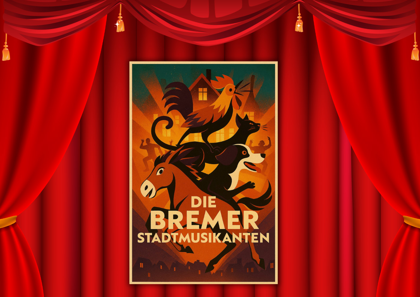 Im Mittelpunkt stehen vier Tiere, die von ihren Besitzern nicht mehr gebraucht werden und sich gemeinsam auf den Weg nach Bremen machen, um dort ein neues Leben als Musikanten zu beginnen. Auf ihrer Reise entdecken sie, wie viel Kraft in Zusammenhalt und Freundschaft steckt. Mutig stellen sie sich den Herausforderungen und zeigen, dass man auch jenseits gewohnter Wege seinen Platz finden kann.