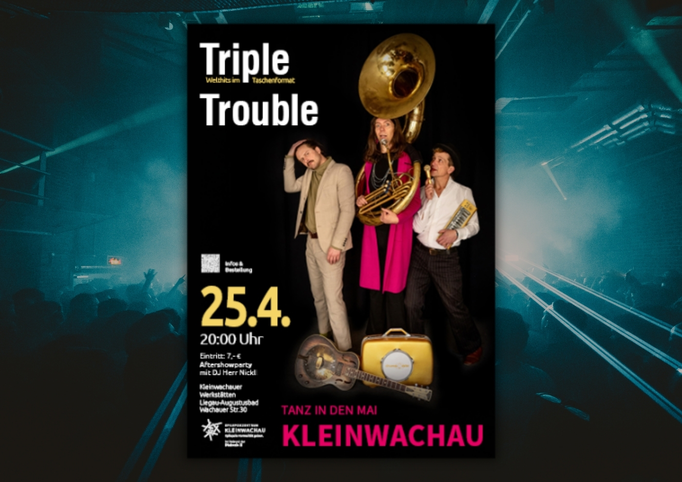 - Triple Trouble (Welthits im Taschenformat). „Trommler der Herzen“ Peuker, Zupfer Röbisch und Marie Klein, die „Grande Dame des Sousaphone“, bedienen sich an den griffigsten Songs der letzten 50 Jahre und werten sie in unerhörtem Gewand zu Kabinettstückchen der postalternativen Popmusik auf. Wer nicht tanzt, ist selber schuld! Mehr Infos zur Band HIER.